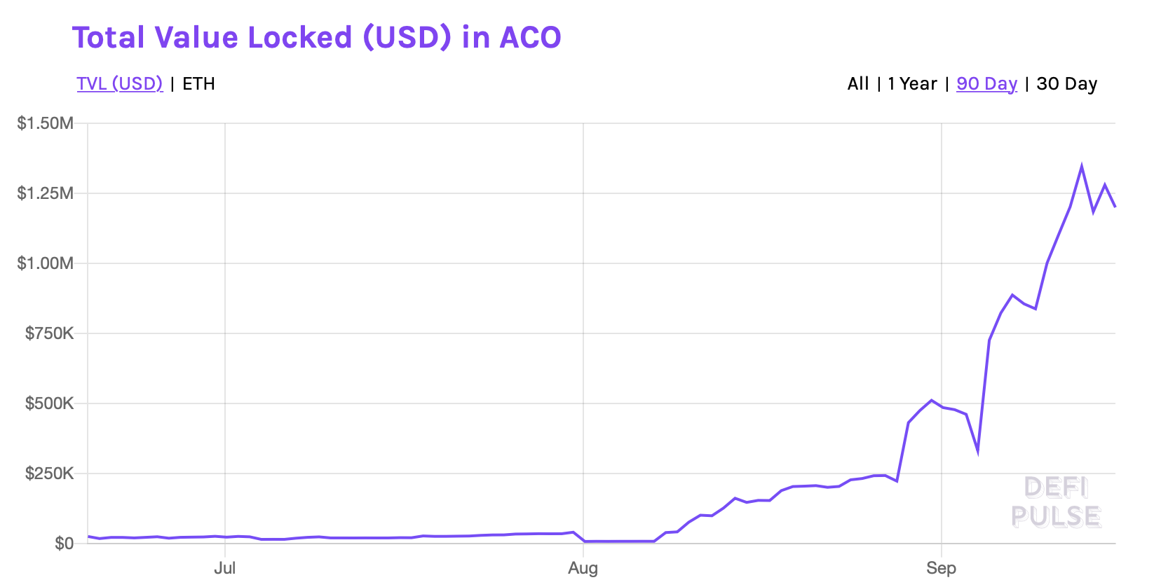 ACO также новый проект на крипторынке, который является дочерней структурой Auctus, и использует модель аналогичную Opyn: позволяет продавать и покупать опционные контракты со 100% обеспечением. Проект предлагает 2 вида контрактов: ETH и YFI. Имеет вторичное обращение опционов в виде ERC-20 токенов на площадке Uniswap. За 1,5 месяца существования проекта объем залоговых средств вырос до 1.2 млн. USDT.