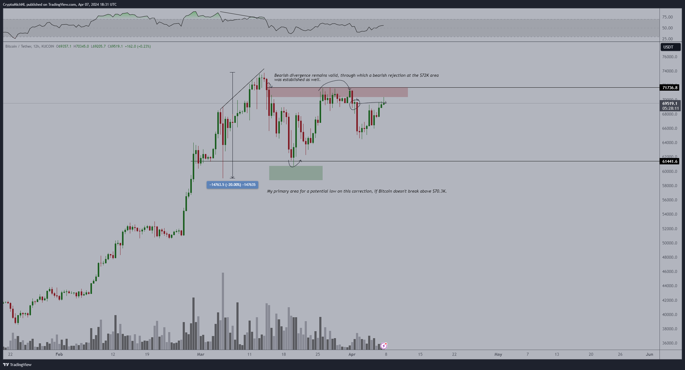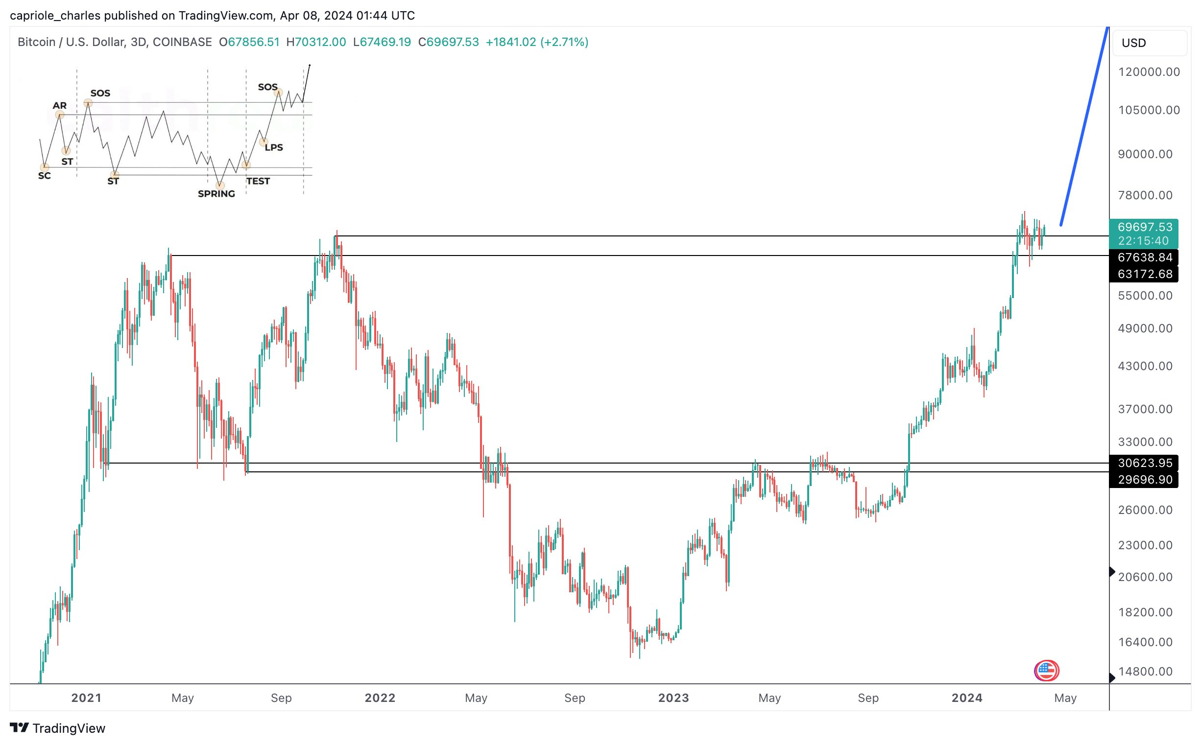 Аналитик Михаэль ван де Поппе обратил внимание на то, что BTC находится близ мощного сопротивления, которое расположилось в диапазоне $70-71 тыс. Его прорыв может открыть криптовалюте дорогу к новому ATH.