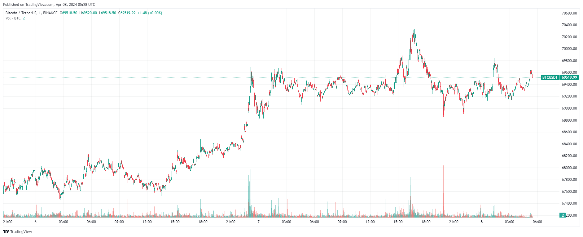 Биткоин начал новую рабочую неделю с бокового движения. На выходных BTC протестировал уровень $70 000. По состоянию на момент написания обзора, биткоин торгуется по $69 519, что на 5,6% ниже абсолютного максимума (ATH), зафиксированного 14 марта 2024 года на высоте $73 750.