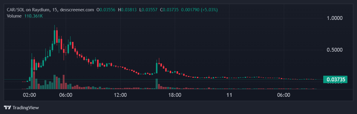 Неизвестный участник криптосообщества получил 2 450 иксов менее чем за три часа благодаря ставке на криптовалюту CAR. По данным аналитиков, первоначальный капитал инвестора составил 25 Solana (SOL) стоимостью $5 тыс. На них трейдер купил 46,57 млн монет CAR. На фоне роста криптовалюты, на которую сделал ставку инвестор, стоимость монет в его распоряжении дошла до $12 млн. Работа заняла менее трех часов.
