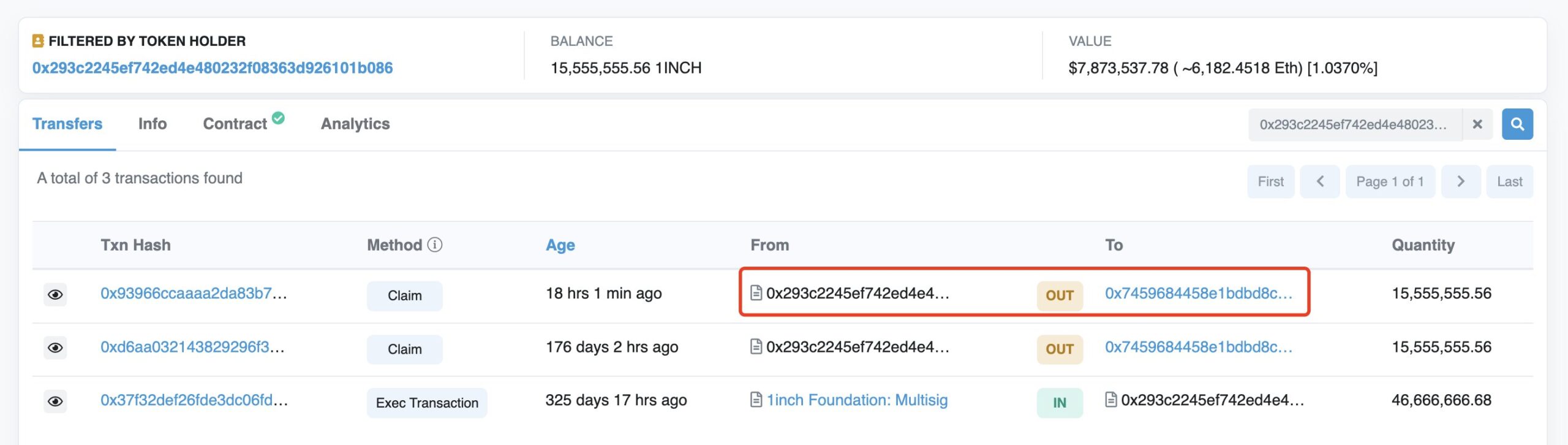 По данным ончейн-трекера Lookonchain, проект 1inch Foundation совершил перевод денежных средств в размере 15,56 млн токенов 1INCH. Таким образом, с платформы было выведено монет на сумму около $8 млн.