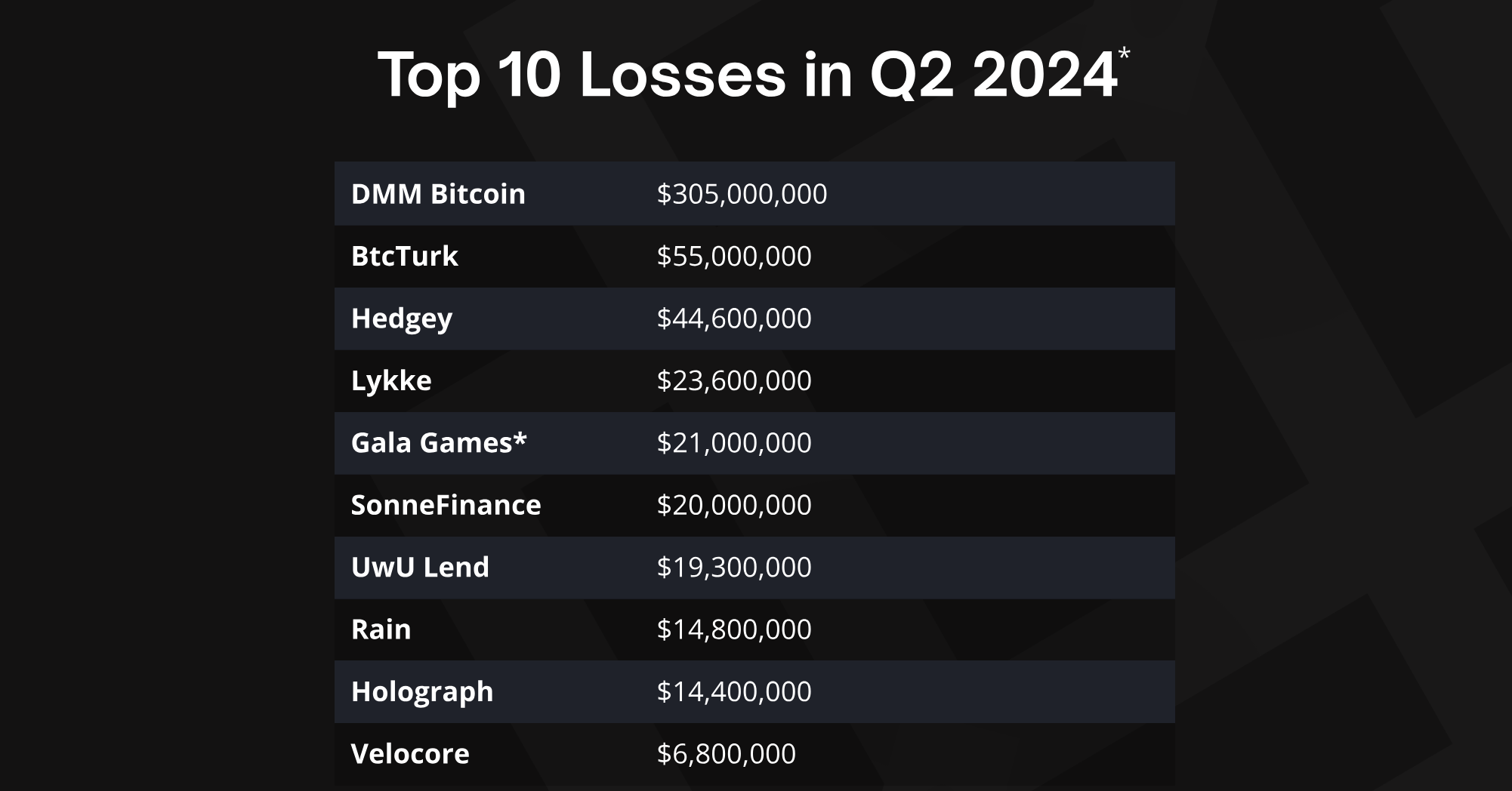Большая часть потерь из общей суммы в $572 млн пришлась на взломы централизованных бирж (CEX). Самой масштабной атакой стал инцидент с торговой площадкой DMM Bitcoin, которая потеряла биткоины (BTC) на общую сумму в $305 млн.