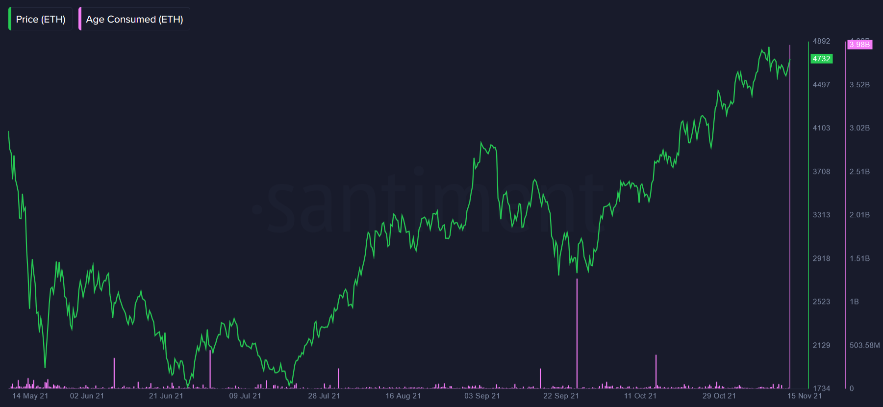 Более 1,8 млн ETH, неактивных последние пять лет, пришли в движение. Об этом у себя в блоге написали аналитики ресурса Santiment. Сообщается, что 15 ноября в сети Ethereum зафиксирована вспышка перемещения более 1,82 млн ETH. Большинство из этих монет перемещались еще в 2016 году.