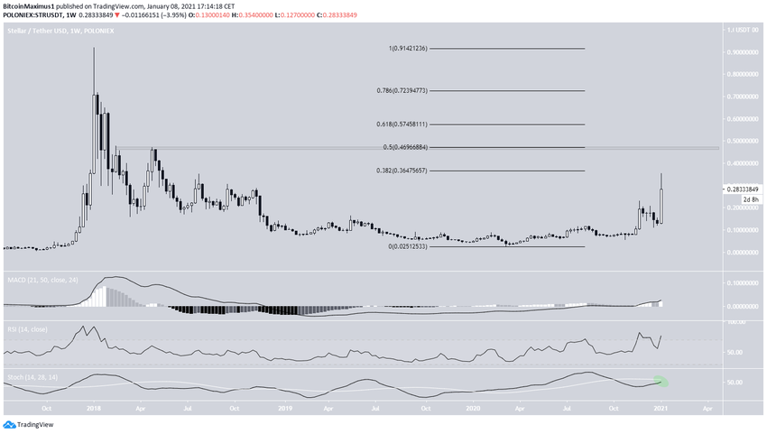 Уровень 0,5 особенно важен, так как он совпадает с областью горизонтального сопротивления $0,47. Таким образом, пока XLM держится ниже этой отметки, долгосрочный тренд нельзя считать бычьим.