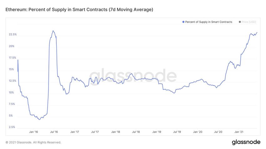 Ethereum постепенно превращается в децентрализованную финансовую прослойку: почти четверть всех монет в обращении заблокировано в смарт-контрактах
