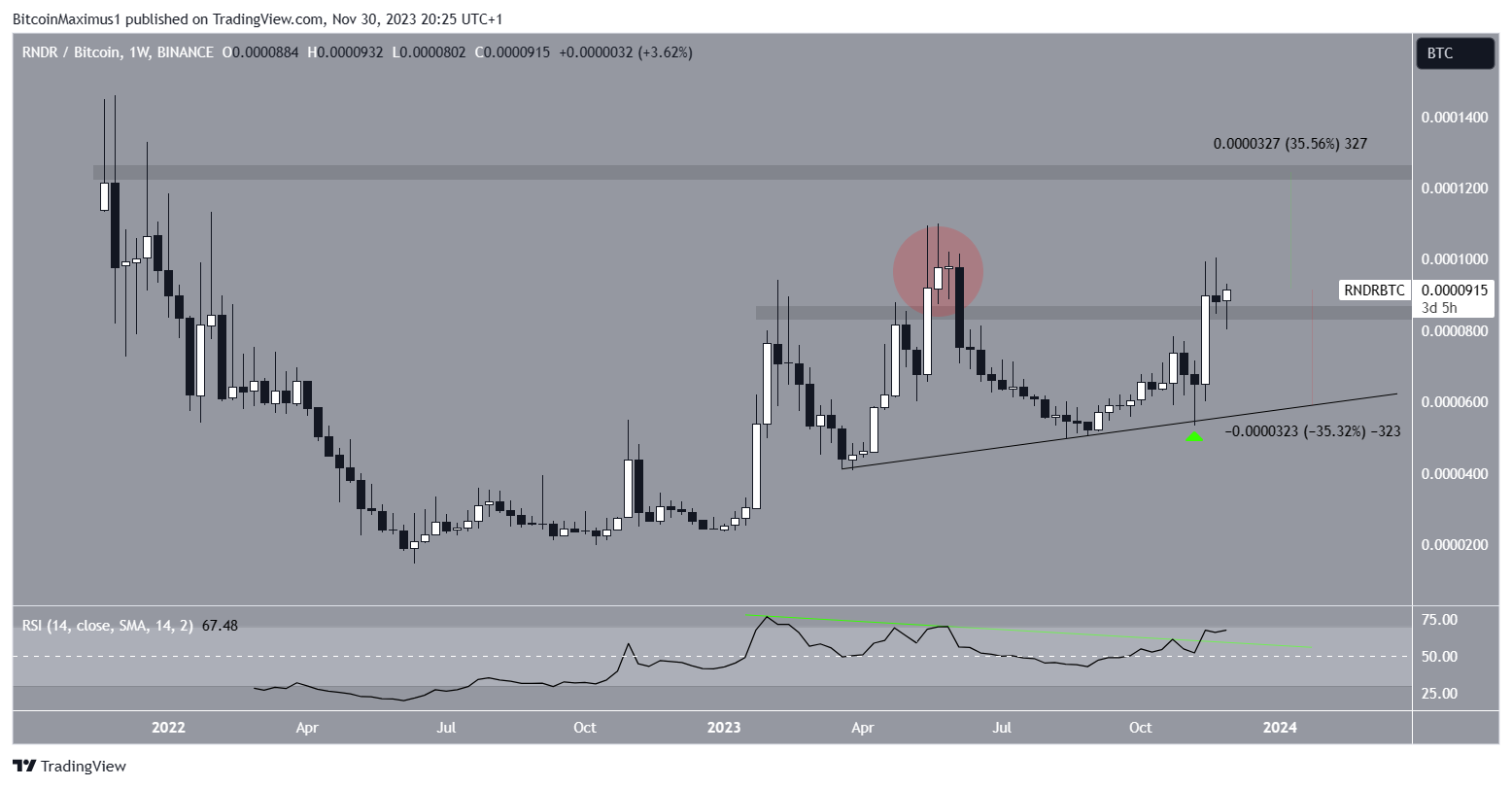 В августе RNDR достиг более высокого минимума, подтвердив восходящую линию поддержки. После отскока в ноябре (на графике он отмечен зеленым значком) он ускорил рост и снова вырвался из области 9000 сатоши.