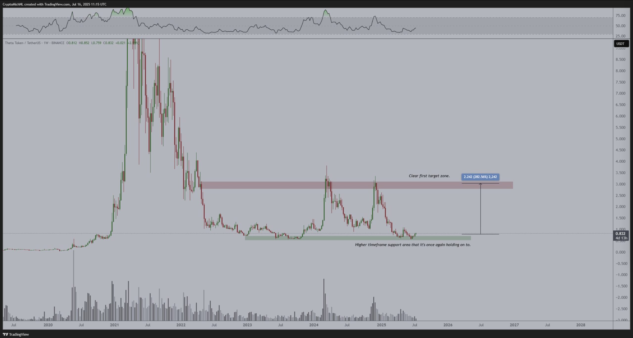 Он отметил, что THETA сейчас находится в зоне накопления на долгосрочном графике. Если положительная тенденция продолжится, он прогнозирует, что токен может вырасти на 280%, что станет значительным приростом для инвесторов.