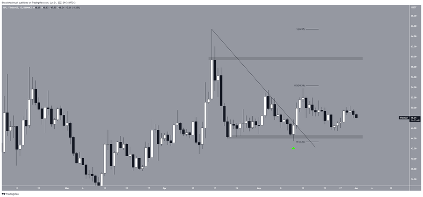 Rocket Pool — это популярная платформа для стейкинга Ethereum. 16 апреля цена RPL достигла исторического максимума на $65,32 и с тех пор двигалась под линией нисходящего сопротивления. Это падение привело к формированию 12 мая минимума на $43,44.