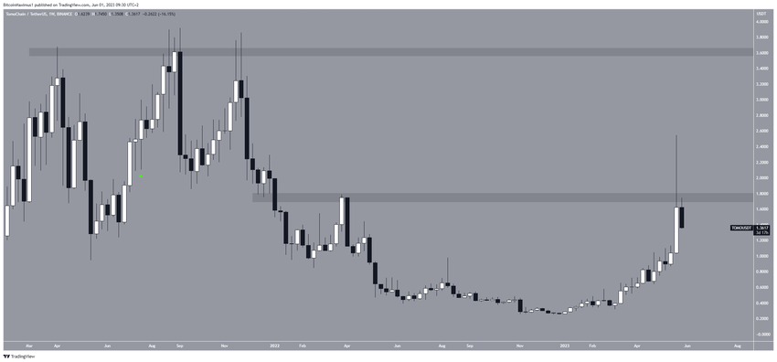 Более того, из-за этого фитиля цена TOMO опустилась ниже горизонтальной области $1,70, которая, как ожидается, будет оказывать быкам сопротивление. Отклонение выше этой области является важным бычьим сигналом, при этом выше на графике не наблюдается больше никакого значимого сопротивления вплоть до исторического максимума в районе $3,60.