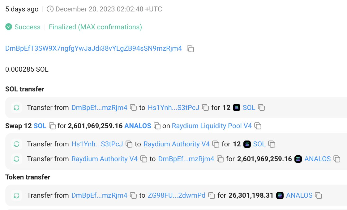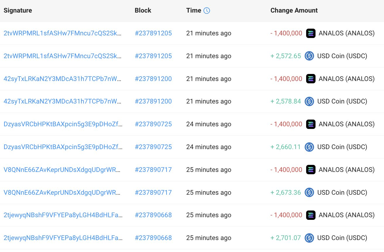 Аналитики Lookonchain поделились со своими подписчиками скринами операций удачливого трейдера. Из них следует, что участник криптосообщества покупал мемкоин за Solana. Всего он купил 2,6 млрд ANALOS, заплатив $900 в токенах SOL.