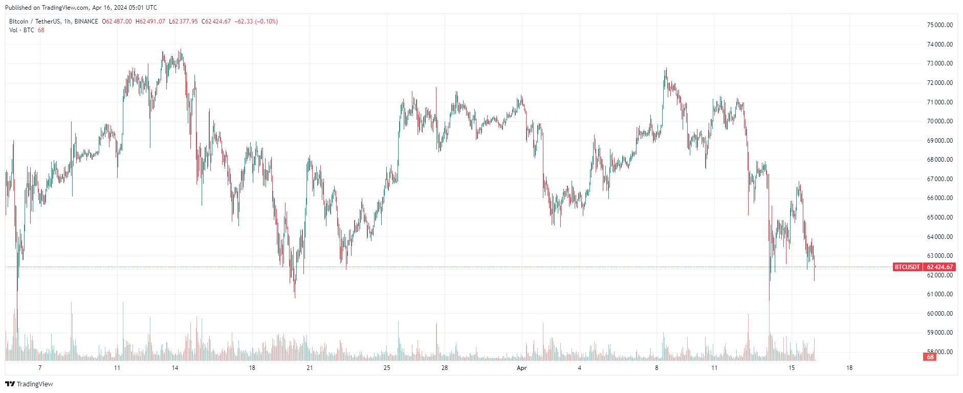 Вчера, 15 апреля, биткоин восстановился до $66 900, а после начал падать. Утром 16 апреля курс криптовалюты опускался до $61 700. По состоянию на момент написания обзора, актив торгуется по $62 424.