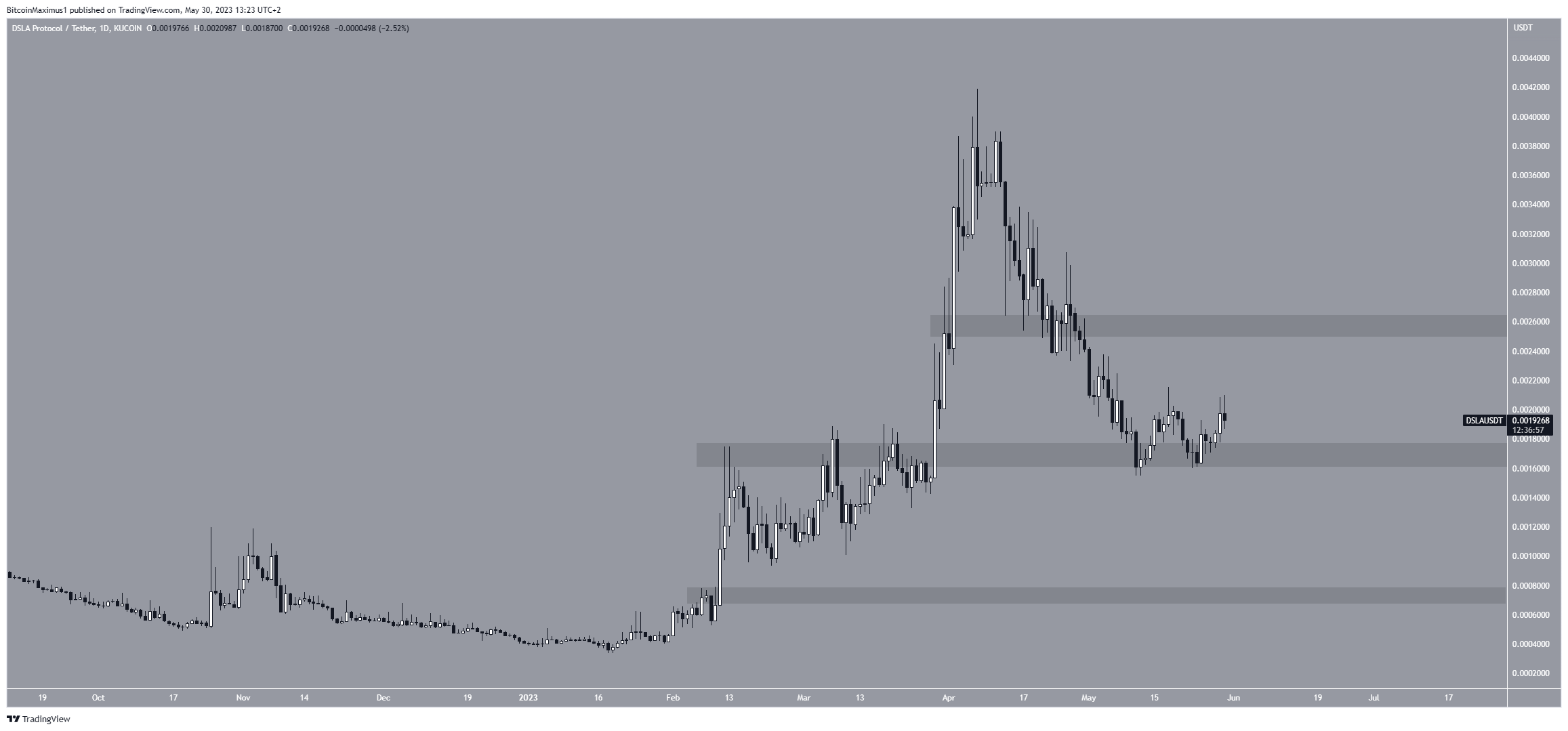 Завершает июньский список альткоинов для наблюдения протокол DSLA. Цена его нативного токена упала с момента достижения годового максимума в $0,0041 7 апреля, что привело к минимуму в $0,0015 11 мая. Однако после этого актив отскочил, подтвердив горизонтальную область $0,0016 в качестве поддержки.