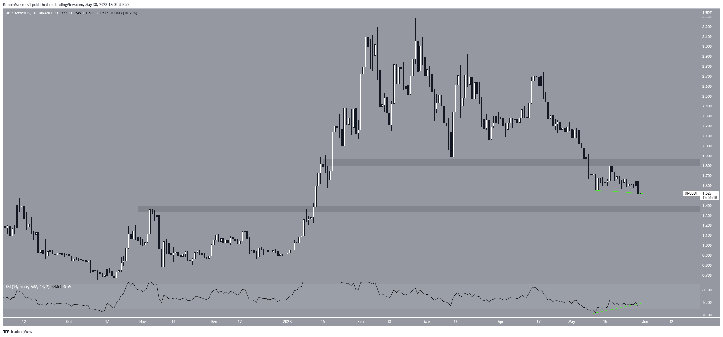 Цена OP упала 24 февраля с момента достижения годового максимума в $3,24. Снижение вызвало пробой горизонтальной области поддержки $1,85 и привело 12 мая к локальному минимуму на уровне $1,48.