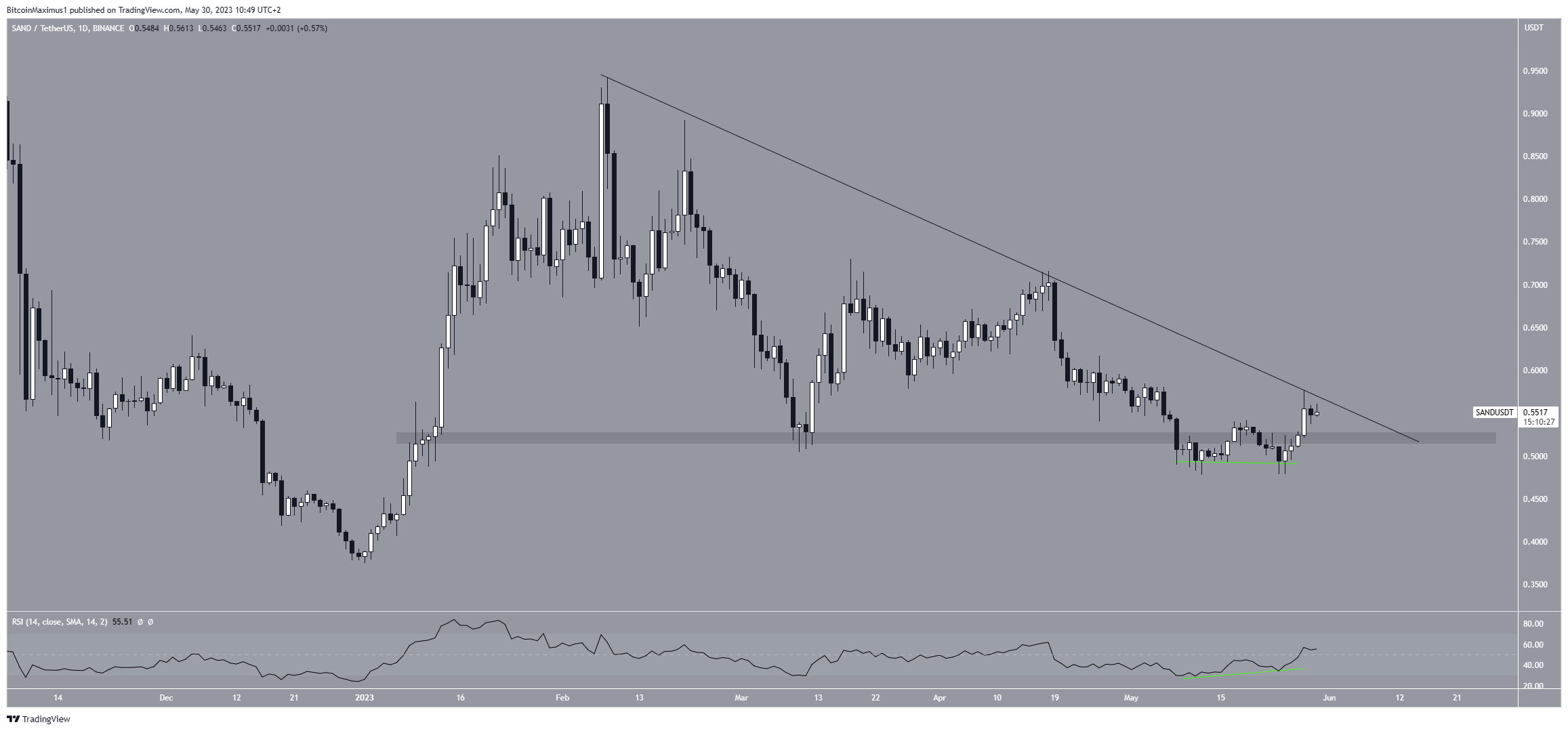 В начале февраля цена SAND опустилась под нисходящую линию сопротивления и пробила к горизонтальную область поддержки $0,52. Однако 28 мая она восстановилась и снова вернулась к этой отметке. Отскоку предшествовало формирование модели двойного дна и бычьей дивергенции на RSI.