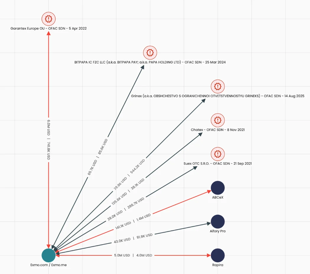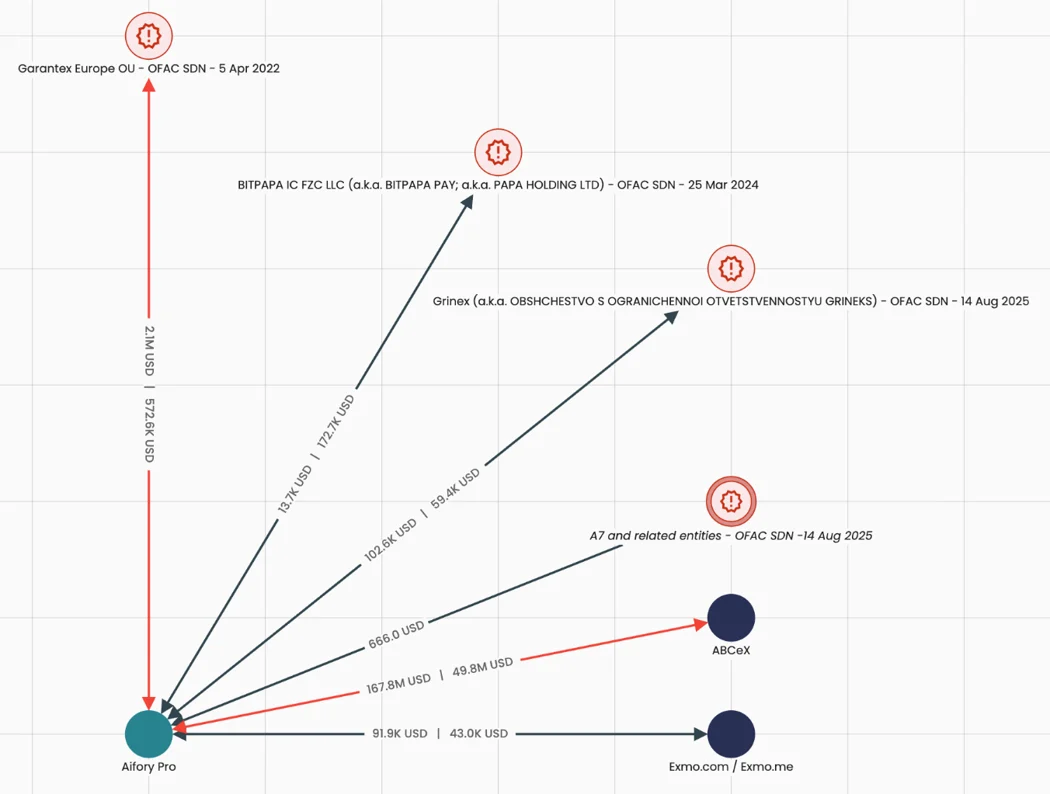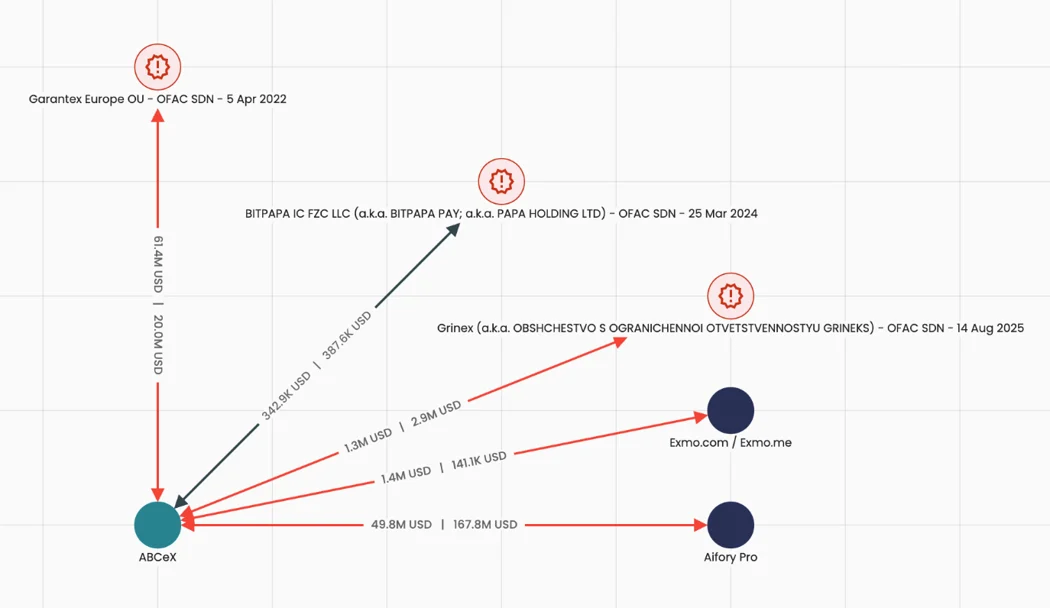 Через ABCeX прошло не менее $11 млрд в криптоактивах. Часть средств переводилась на адреса Garantex и Aifory Pro, что отражено в ончейн-данных Elliptic. Платформа также применяет методы сокрытия транзакций и запутывает структуру кошельков, скрывая прямую связь переводов с сервисом.