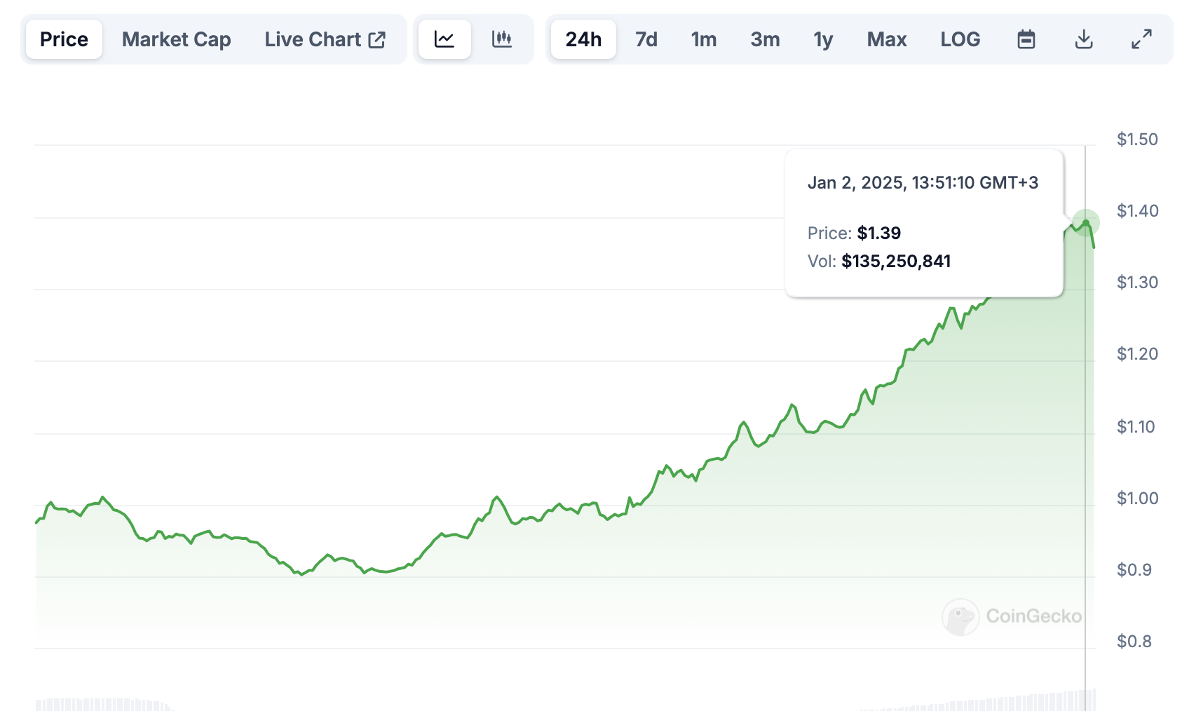 За минувшие сутки FARTCOIN вырос на 37% и установил новый исторический максимум на отметке $1,39. Устойчивая восходящая динамика подтверждает высокий интерес к мемкоину со стороны инвесторов.