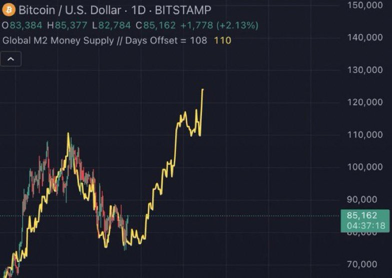 Криптоинвесторы обращают внимание на то, что BTC повторяет движения графика мировой ликвидности (M2). В апреле 2025 криптовалюта еще не успела реализовать траекторию движения метрики. Многие инвесторы уверены в том, что в ближайшее время BTC все же последует за M2.