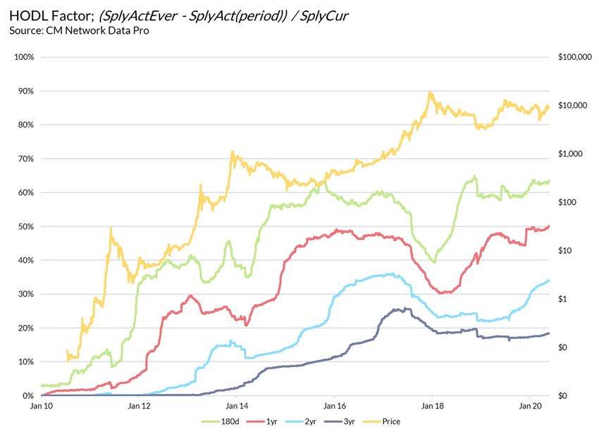 Преданные ходлеры биткоина продолжают держать в статичном состоянии впечатляющее количество от общего объема находящихся в обращении коинов BTC. Пользователь Twitter Benjamin Celermajer (@CelermajerB) поделился со своими читателями последней статистикой на эту тему. Согласно данным криптоаналитического ресурса Coin Metrics, показатель биткоинов, не приходящих в движение один год (1-year HODL Factor), впервые превысил порог 50%, обновив исторический максимум.