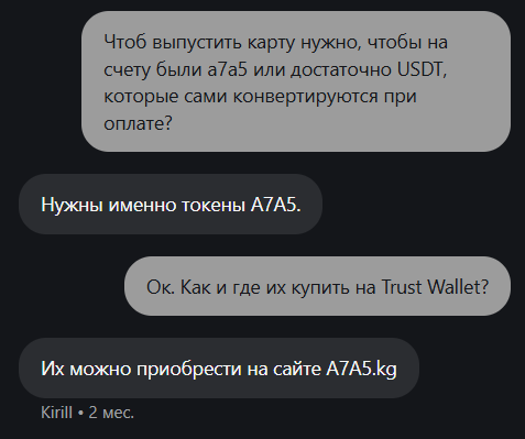 Также у редакции BeInCrypto сохранился скрин переписки со службой поддержки A7A5, в которой они не отрицают причастность к выпуску криптокарт.