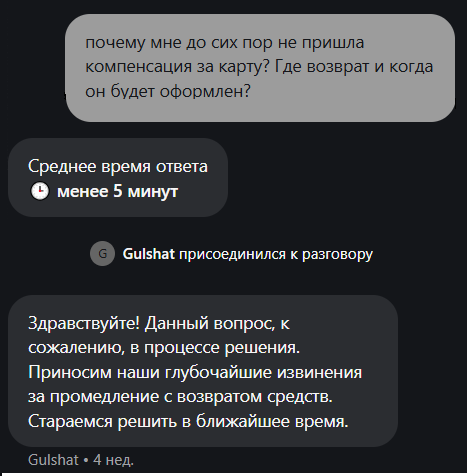Но у редакции BeInCrypto сохранилась переписка со службой поддержки проекта. В качестве решения проблемы нам предложили вернуть деньги за открытие карты. Сроки, к сожалению, не были обозначены.