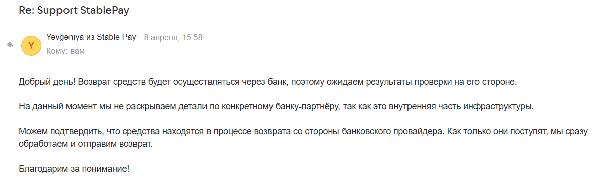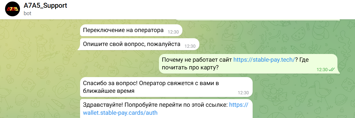 Подводим итоги. Начало переписки с StablePay датировано 15 февраля. В этом же месяце была оформлена карта. По состоянию на 28 апреля 2026 года нет ни четкой информации о сроках возврата денег за оформление виртуального пластика, ни комментариев A7 о возникших проблемах.