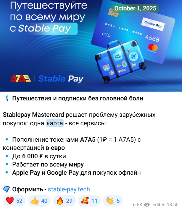 Многие города России утопают в рекламных баннерах компании A7, которая стоит за нашумевшим рублевым стейблкоином A7A5. Пока предприниматели жалуются на ухудшение условий для ведения бизнеса в РФ, криптопроект, судя по данным об экспансии, уверенно стоит на ногах. При этом к некоторым продуктам компании есть серьезные вопросы. Например, пользователи, которые оформили криптокарту проекта через stable-pay, потеряли деньги.
