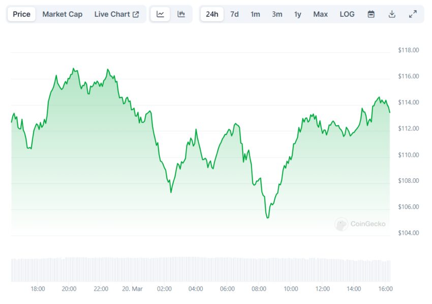 По данным CoinGecko, нативный токен экосистемы Aave на новость о раздаче токенов практически не отреагировал. За последние сутки курс актива вырос на незначительные 0,7% и на момент написания материала составляет $113,43. В общей сложности за прошедший месяц AAVE подорожал на 17%.