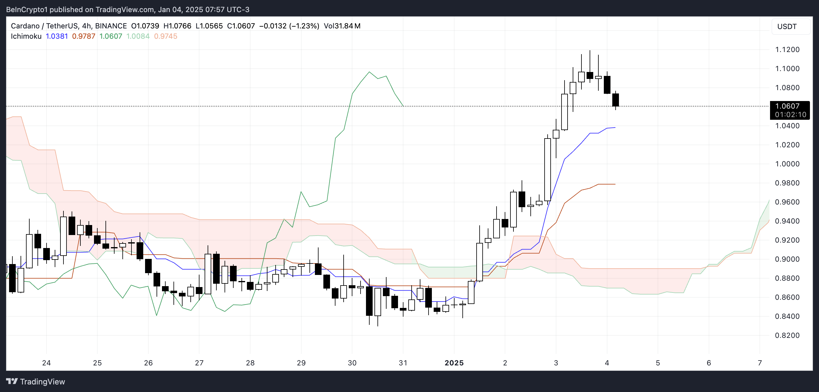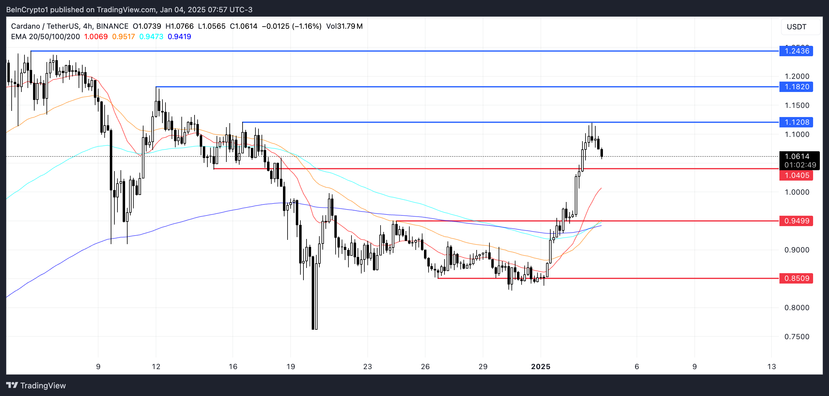 Цена Cardano образовала золотой крест 3 января, когда ее краткосрочная линия EMA пересекла более долгосрочные линии. Если этот импульс продолжится, ADA может продолжить рост и протестировать сопротивление на уровне $1,12.