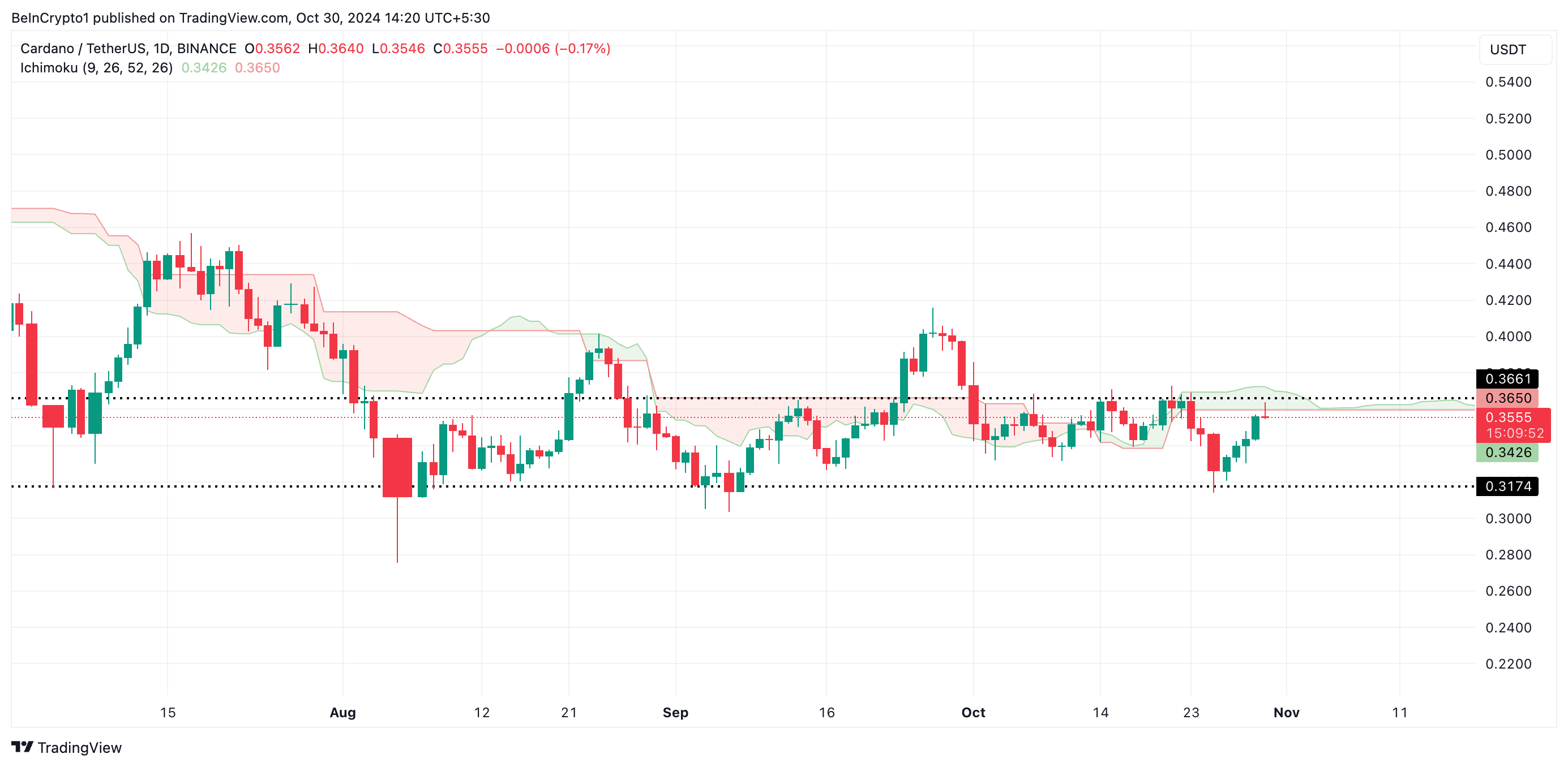 За последние четыре дня Cardano вырос на 10%, превысив индикатор Leading Span B (красная линия) облака Ишимоку. Преодоление этого барьера свидетельствует о том, что цена движется выше ключевого уровня поддержки облака Ишимоку. Это часто рассматривается как бычий сигнал, указывающий на то, что покупатели усиливают контроль.