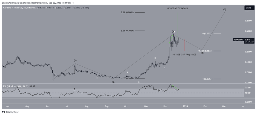 Наиболее вероятный сценарий волнового анализа Эллиотта предполагает, что ADA не прорвется выше сопротивления $0,68. Скорее, она начала четвертую волну в рамках пятиволновой бычьей структуры (черный цвет). Подволновой анализ представлен на графике белым цветом.
