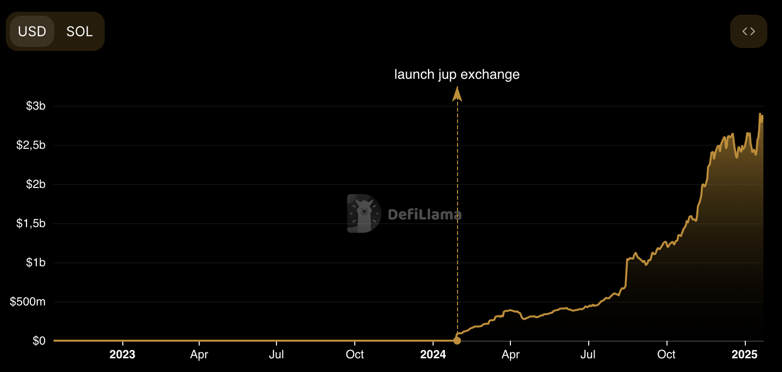 Согласно DefiLlama, общая стоимость заблокированных средств (TVL) Jupiter сейчас составляет $2,8 млрд.