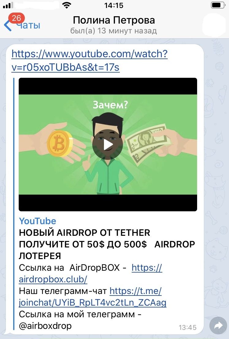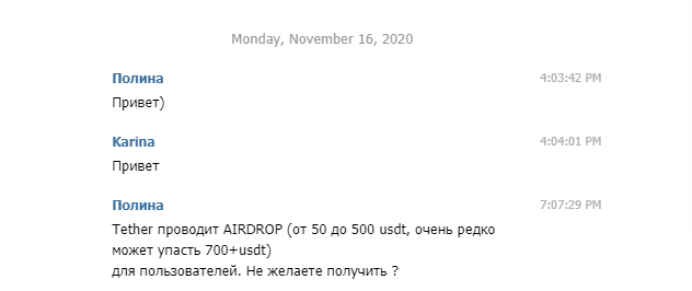 Чаще всего мошенники в сети используют социальные сети для поиска и привлечения будущих жертв. Главными инструментами кибермошенников являются Facebook и Twitter. А совсем недавно этот список дополнил и мессенджер Telegram. Именно здесь я получила сообщение от неизвестного контакта, подписанного, как Полина Петрова. Она предложила мне поучаствовать в airdrop от Tether.