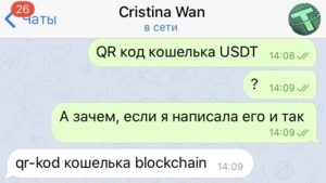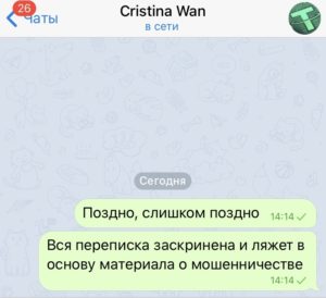 Я отказалась генерировать QR-код и честно сказала, что я журналист криптоиздания. Через секунду вся переписка с Cristina Wan исчезла.
