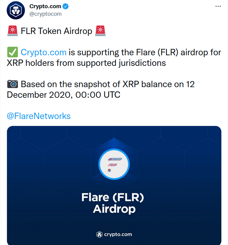 Право на свою долю монет получат владельцы XRP, хранящие свои коины на биржах, участвующих в акции. В частности, о поддержке аирдропа Flare (FLR) сообщила сегодня, 20 октября, торговая платформа Crypto.com.