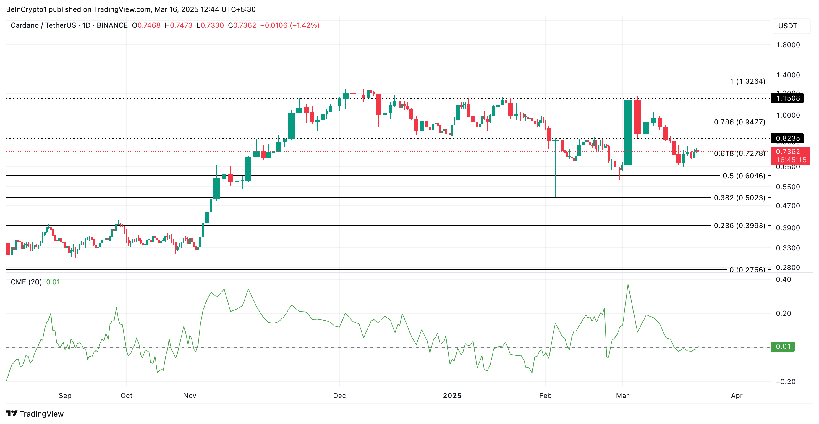CMF оценивает движение денег в актив и из него. Значение выше нуля указывает на преобладание покупательского давления и рост спроса, что создает бычий импульс на рынке. Если эта тенденция продолжится, ADA может продолжить рост и достичь отметки $0,82.