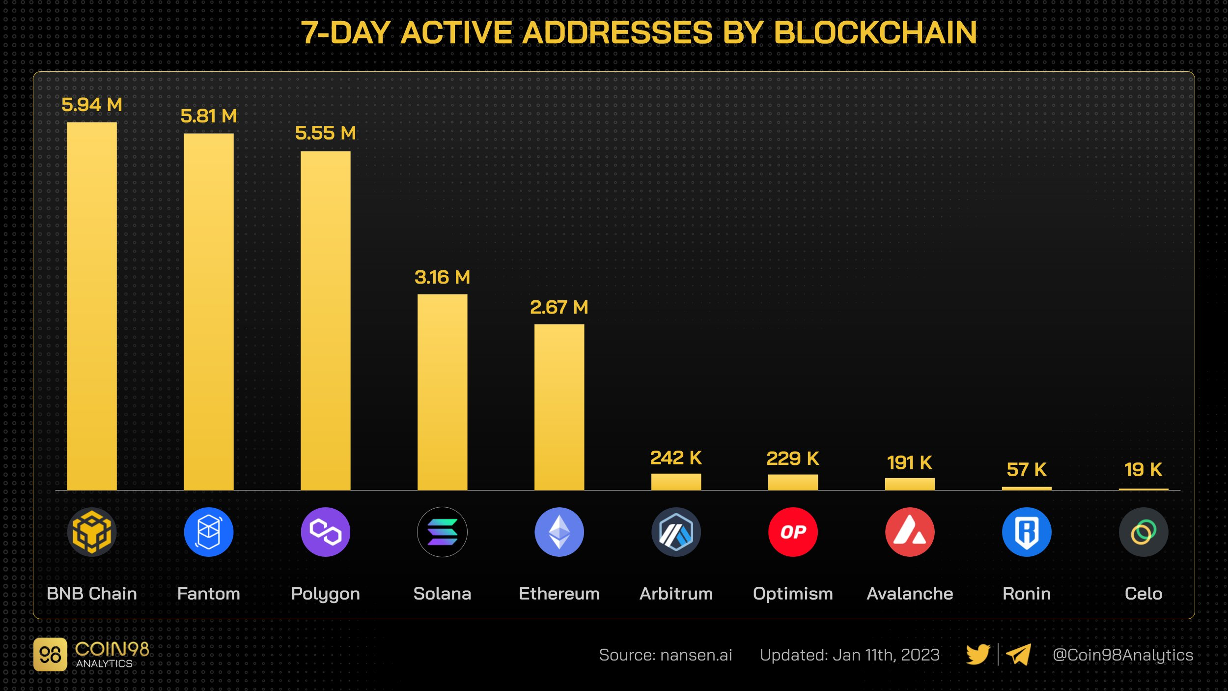 Coin98Analytics cообщает, что Solana занимает четвертое место по количеству активных адресов за последнюю неделю.