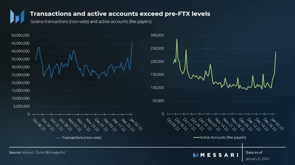 Ончейн-активность в сети Solana демонстрирует признаки восстановления. По данным аналитической платформы Messari, объемы транзакций и активных счетов вернулись к уровням октября 2022 года, а количество активных адресов выросло до 240 000.