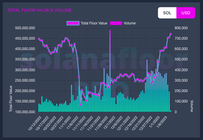 Стоимость NFT-экосистемы Solana также вернулась к прошлым уровням и достигла $470 млн.