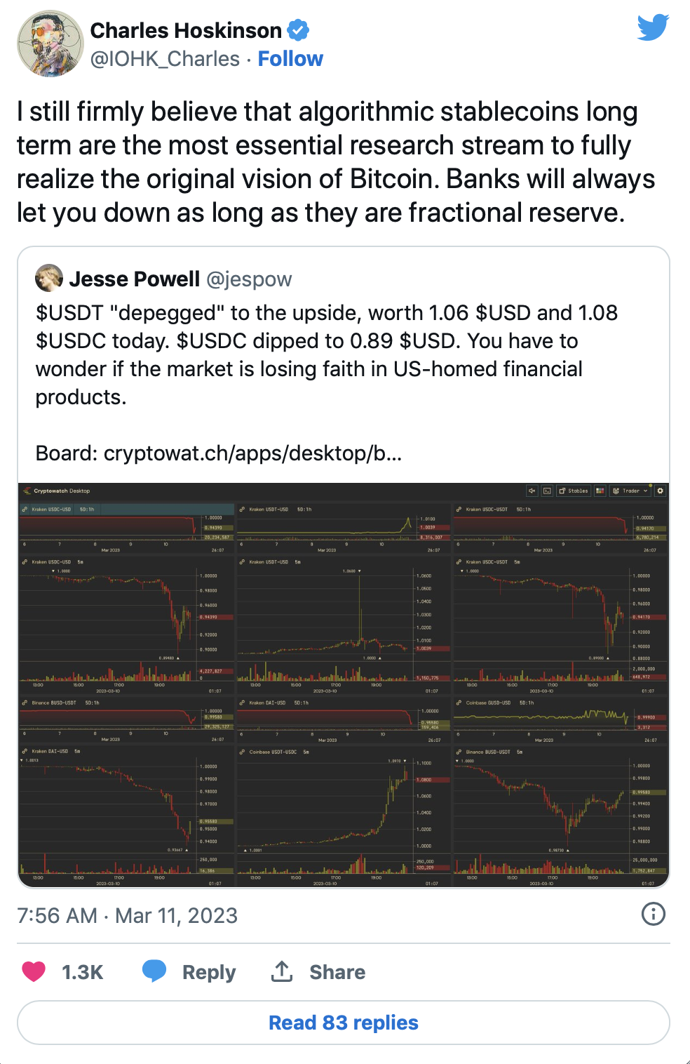 Хоскинсон отреагировал на замечание генерального директора Kraken Джесси Пауэлла о том, что стоимость USDT выросла вслед за падением конкурирующего стейблкоина USDC. По словам Пауэлла, криптовалютный рынок теряет веру в американские финансовые продукты. В ответ Хоскинсон написал в «Твиттере», что «алгоритмические стейблкоины… являются наиболее важным направлением исследований для полной реализации первоначального видения биткоина».