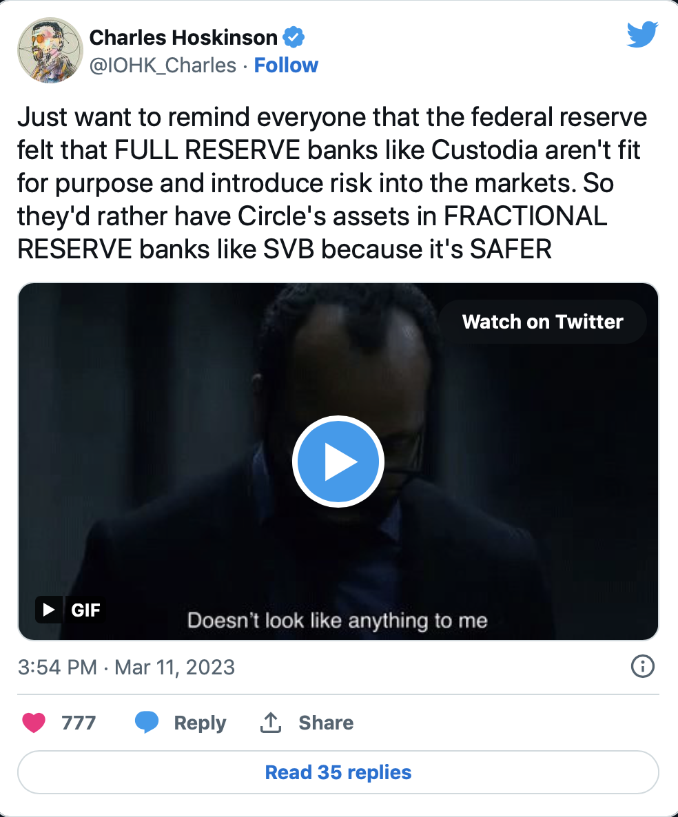 Основатель Cardano также раскритиковал отказ Федерального резерва от услуг банка Custodia. По его словам, власти считают, что полнорезервные банки вносят риск на рынки, поэтому предпочитают держать активы Circle в банках с дробными резервами – таких, как SVB.