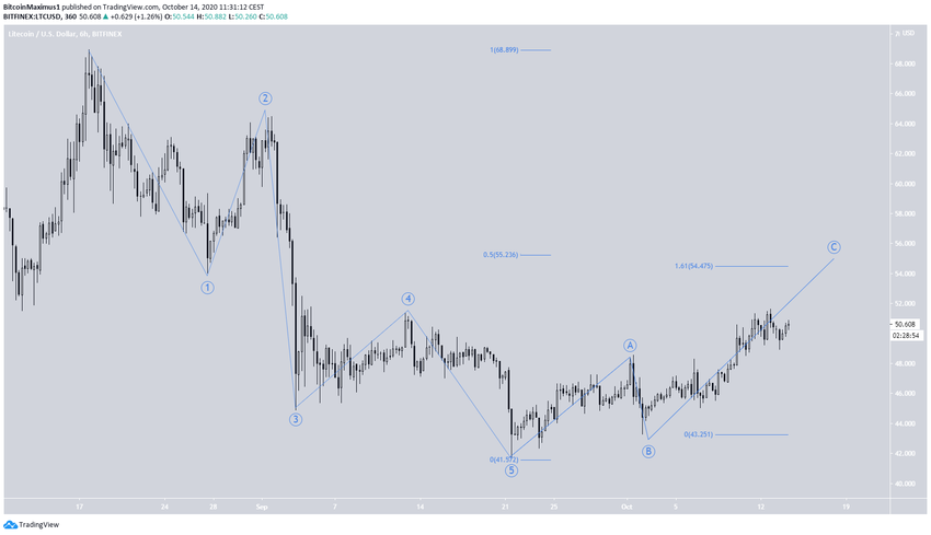 Если так, Litecoin приступил к коррекции A-B-C (голубой цвет), которая должна завершиться вблизи ранее упомянутого сопротивления $54.