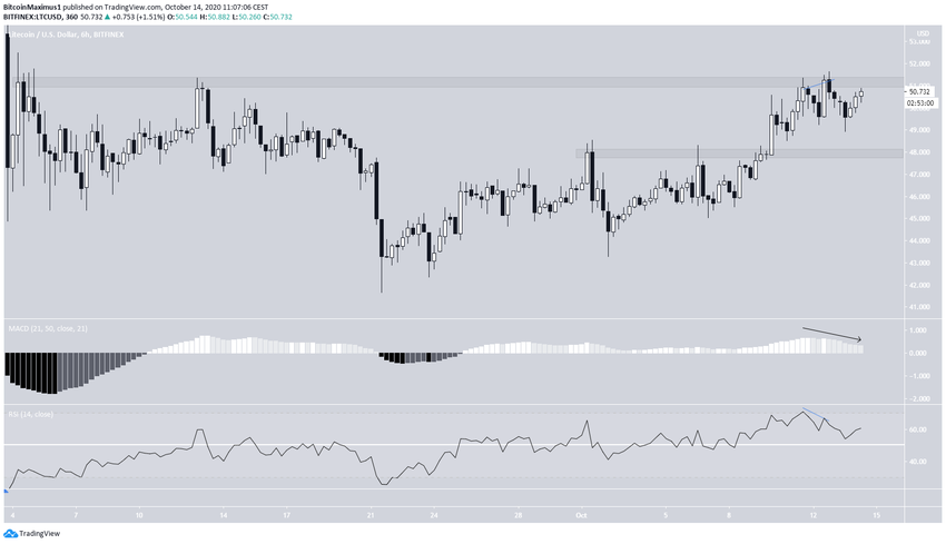 На 6-часовом графике видно, что цена тестирует промежуточное сопротивление $51, над которым альткоин не поднимался с 5 сентября. Это уже третья попытка пробоя этой зоны.