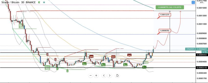 Криптовалютный трейдер @CryptoNewton пишет, что открыл длинную позицию по STRAT, выставив цель на уровне 140 000 сатоши.