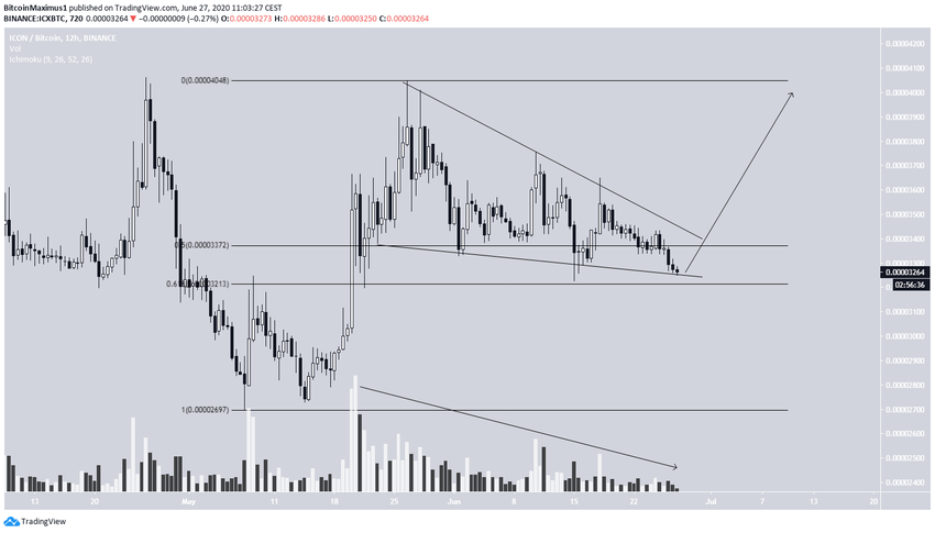 ICX падает с 26 мая, когда был достигнут максимум ₿0.00004046. Снижение происходит в форме нисходящего клина, который считается паттерном бычьего разворота. Снижение торговых объемов с момента достижения максимума говорит о грядущем решительном движении.