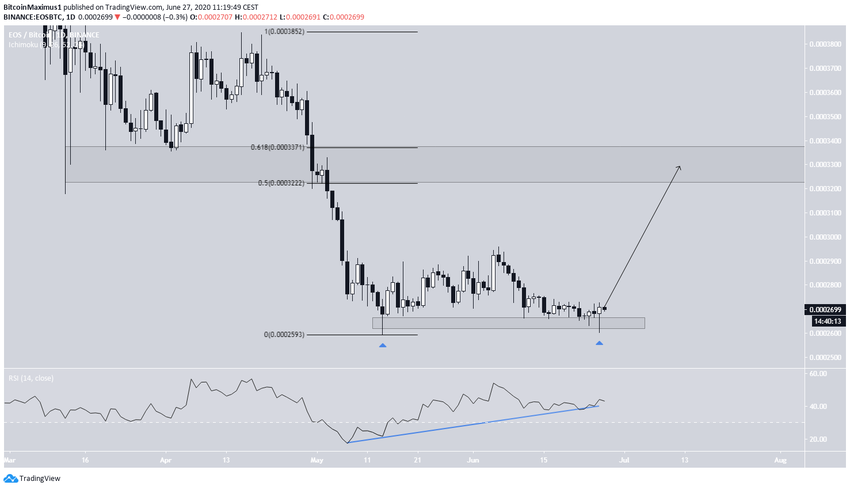 14 мая EOS достиг минимума 25 930 сатоши, сформировав фигуру молот на свечных графиках. После двухнедельного подъема котировки возобновили снижение.