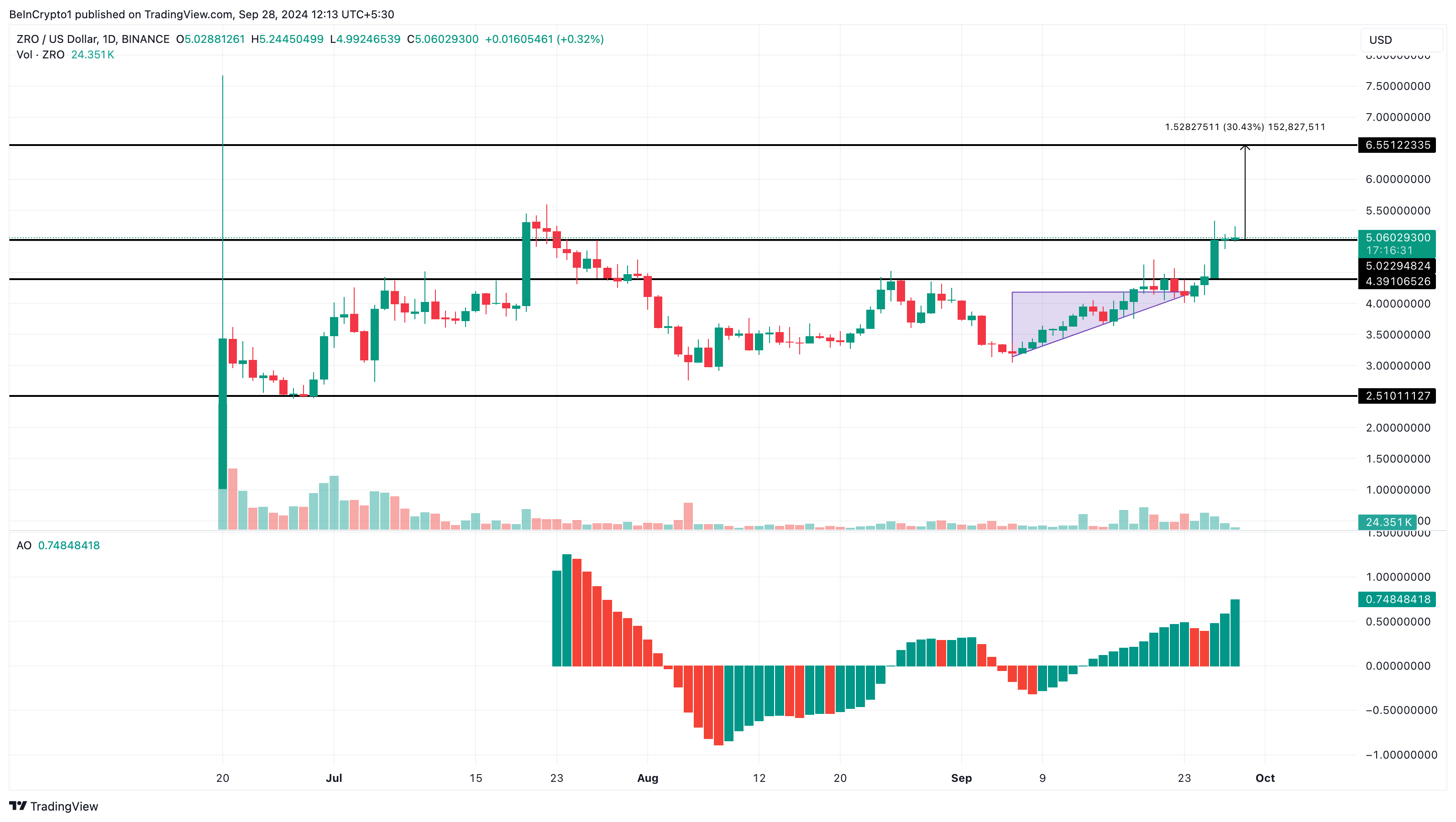 Если тенденция сохранится, в октябре цена ZRO может превысить предыдущий исторический максимум в $5,60 и направиться к новому рекорду в $6,55. Однако если усилий быков окажется недостаточно, альткоин ждет коррекция до $4,39.