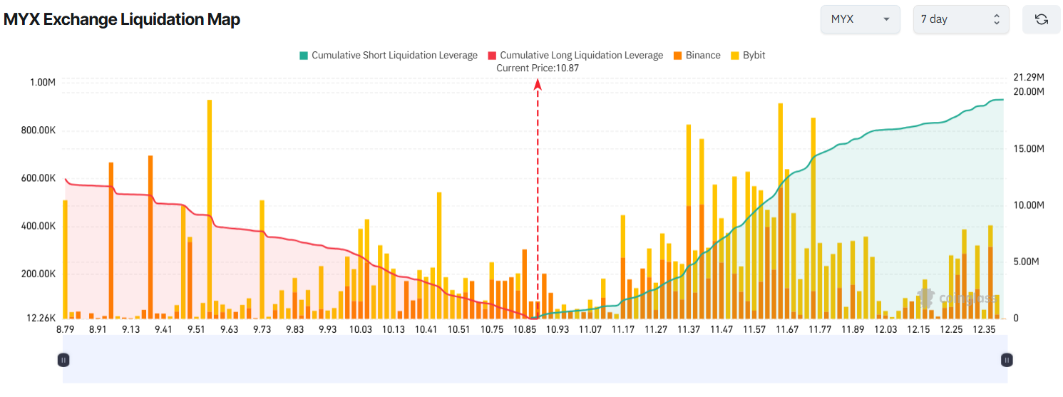 На деривативных рынках картина обратная ETH и BNB: преобладают короткие позиции. Семидневная карта ликвидаций показывает, что при росте MYX до $12,35 будут закрыты шорты на сумму свыше $19 млн. Если же цена упадет до $8,79, ликвидируют длинные позиции на $12 млн.