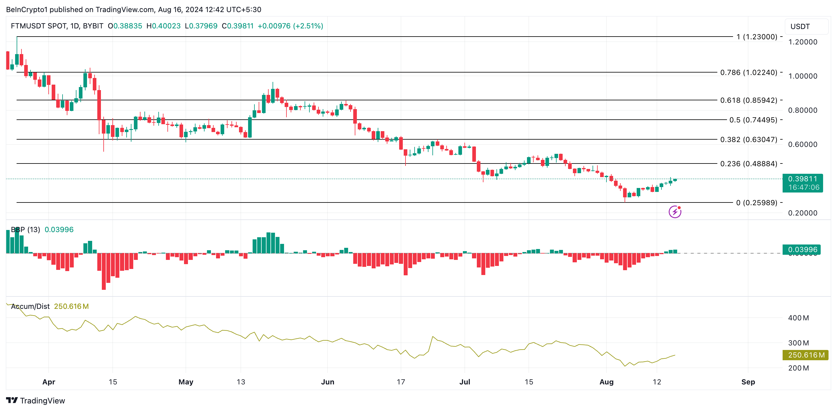 Рост линии накопления/распределения (A/D) FTM подтверждает увеличение спроса на альткоин. На данный момент она составляет 251,31 млн и выросла на 14% за прошедшую неделю.
