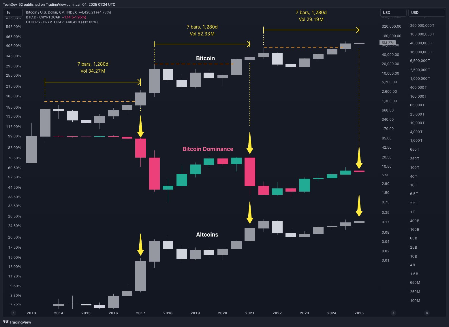 По словам TechDev, исторически альтсезон начинался после того, как биткоин формировал новую шестимесячную свечу, преодолевая максимум текущего цикла.