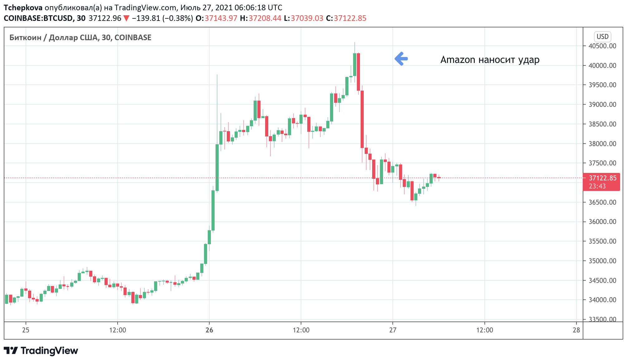 Однако после того, как Amazon опроверг слухи о намерении принимать платежи в биткоинах, рынок рухнул под отметку $37 000 и протестировал минимум $36 700. В считаные часы первая криптовалюта подешевела почти на $4 000. На момент написания материала BTC/USD торгуется на уровне $37 100.
